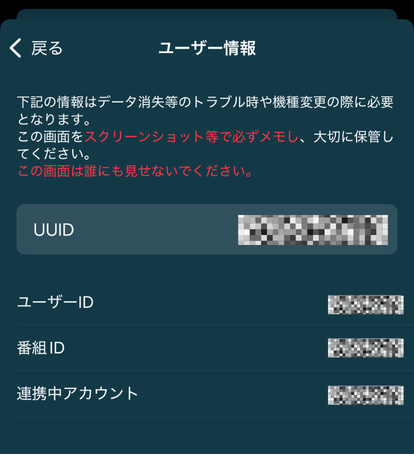 保存したスクリーンショットに「UUID」「ユーザーID」「番組ID」「連携アカウント」が記載されていることをご確認ください。
