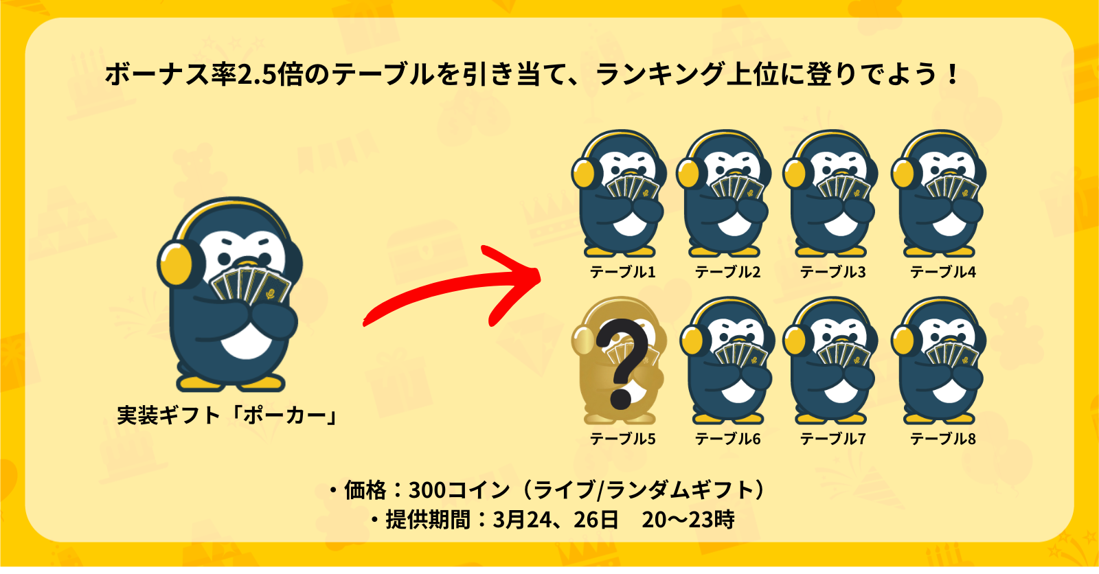24日、26日ともに、ボーナスタイムへの突入率が2.5倍のギフトの場所(テーブル)は変更しません。