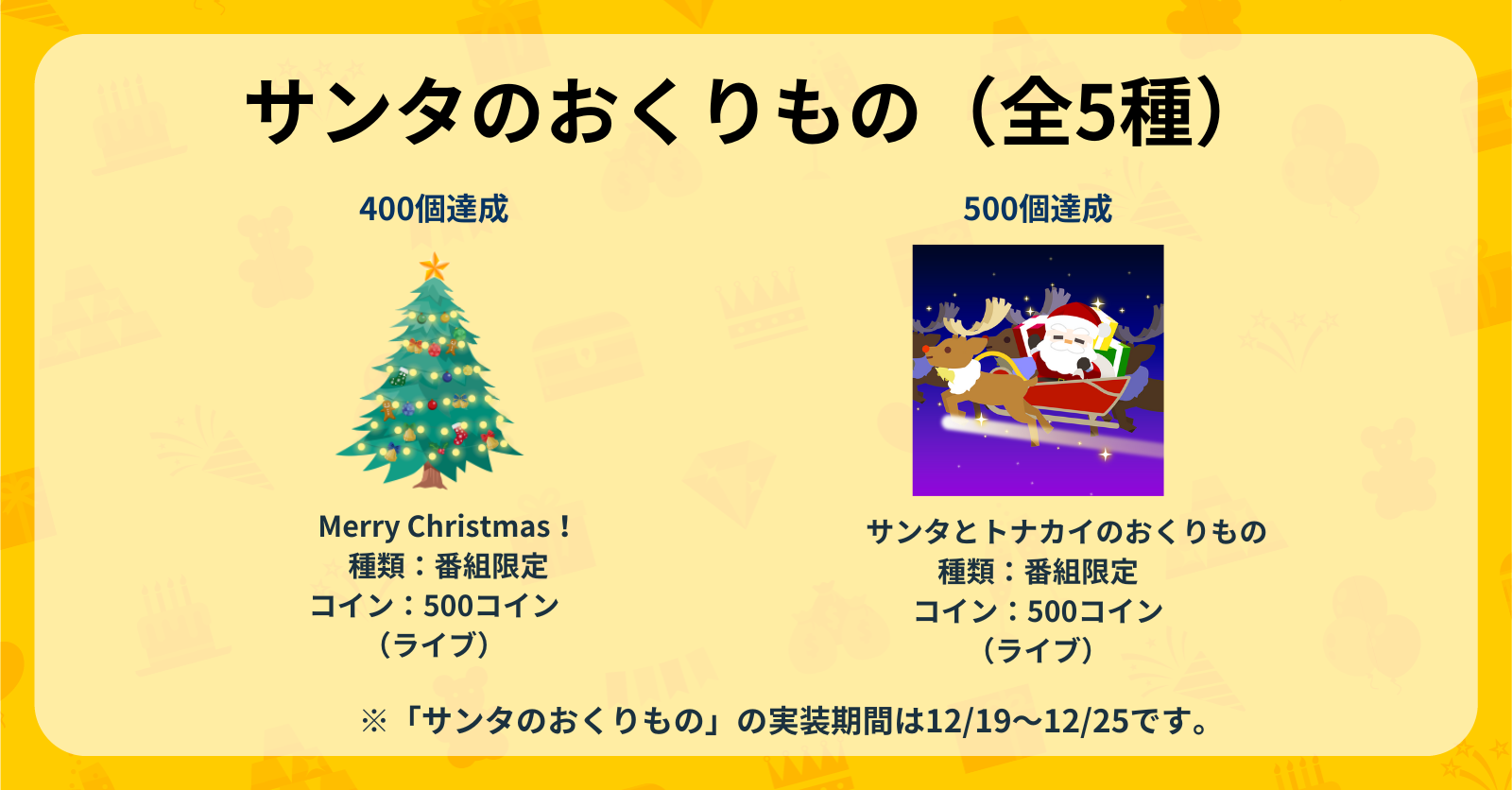 12月6日(土)〜12月12日(金)で開催中の「サンタのおくりもの」イベントにて獲得した「サンタのくつした」の個数に応じてギフトを実装!