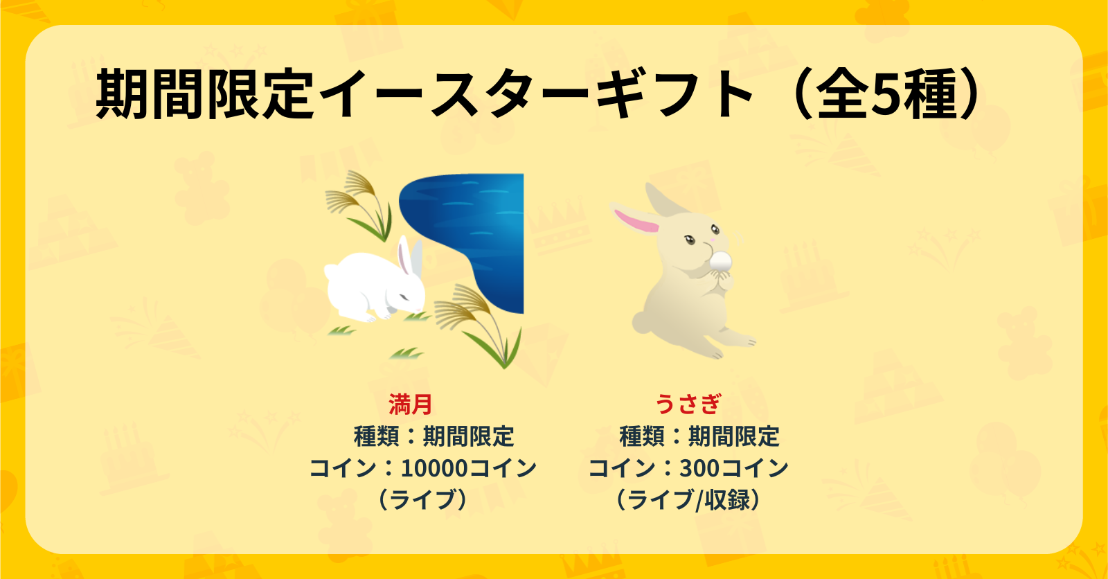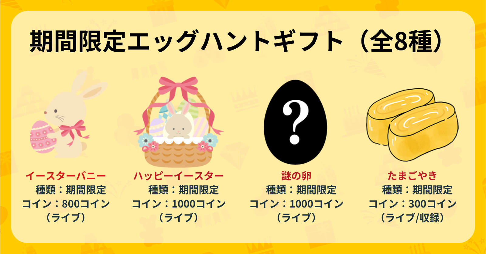 今回実装中の全8種の期間限定エッグハントギフト(ライブ限定)では、一定確率で「スペシャルイースター」が出現!各ギフトと出現確率は以下を参照。