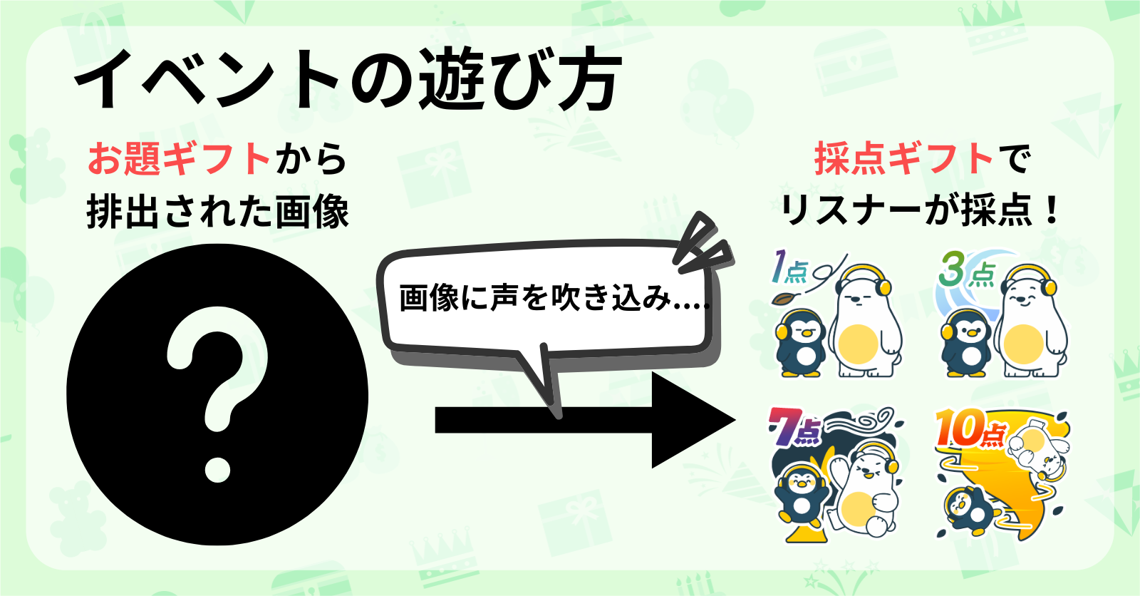「お題ギフト」から排出される一枚の画像に、その場で声を吹き込むイベントになります。