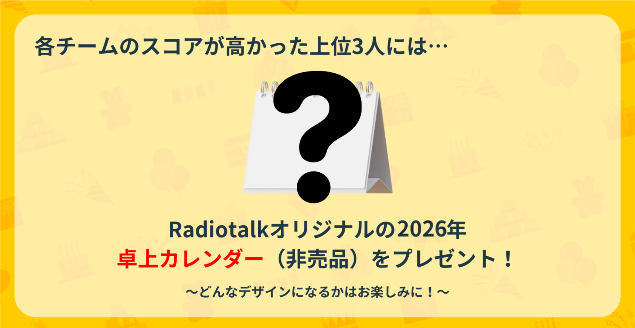 さらに、各チームのスコアが高かった上位3名には、Radiotalkのロゴが入った2026年版カレンダー(非売品)をプレゼントします!