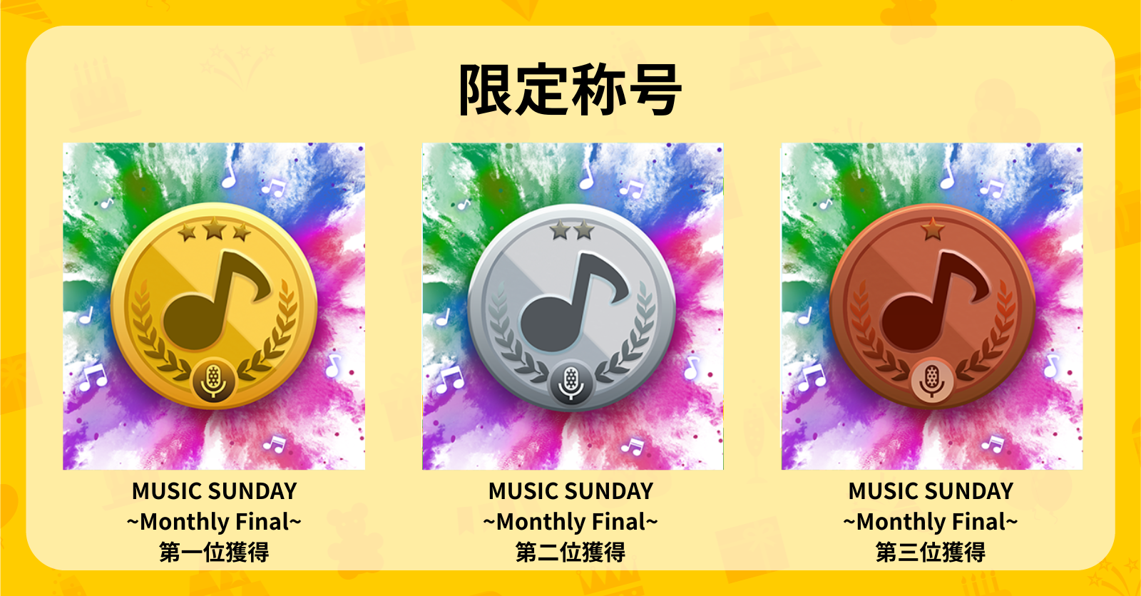「MUSIC SUNDAY ~Monthly Final」で1位〜3位となった配信者には各称号を付与いたします。