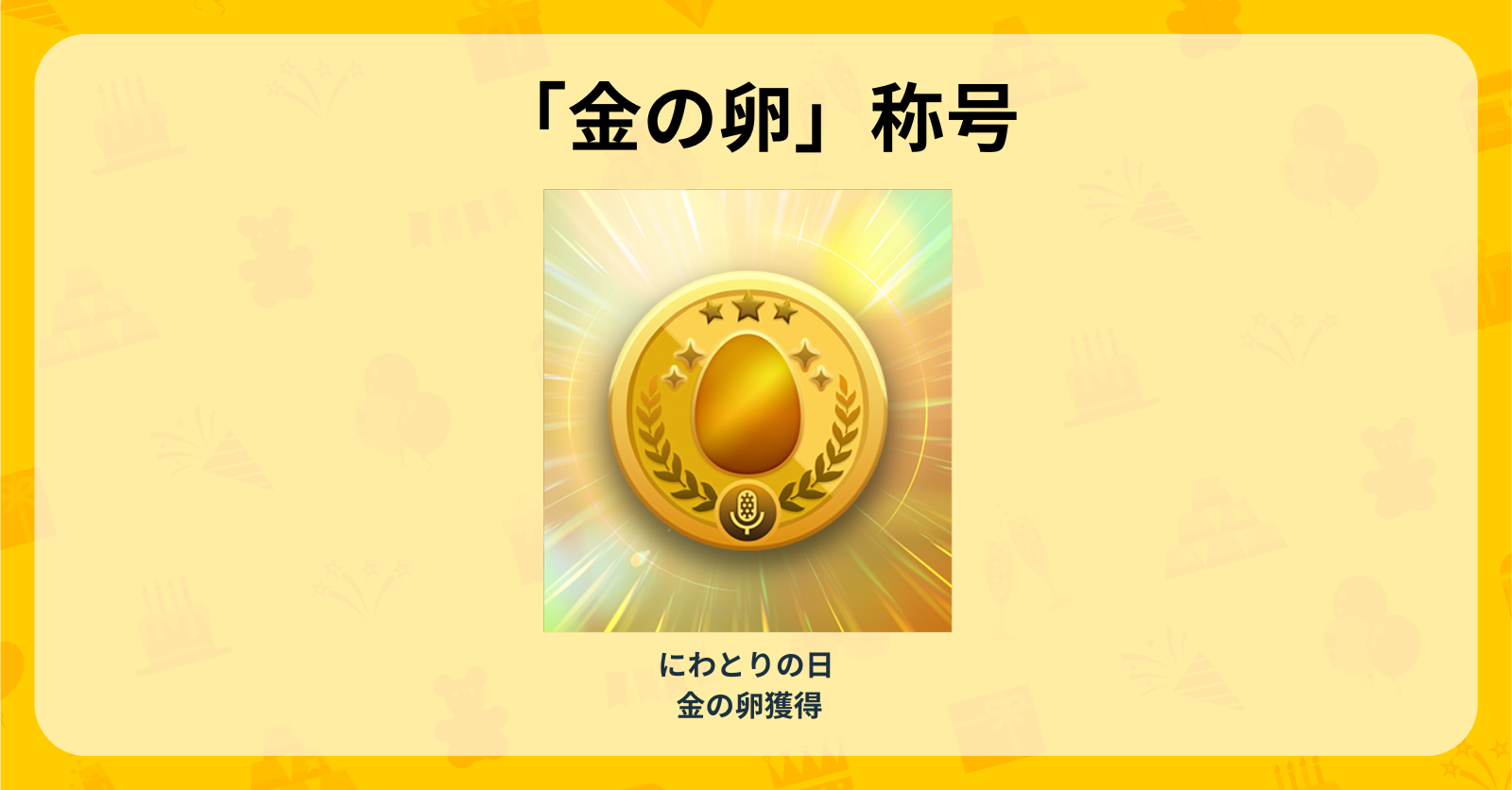 2026年4月開催の「にわとりの日」イベントから、0.5%の確率で排出される「ポトッ….」(金の卵を産む演出)を贈った方に限定称号を付与いたします。