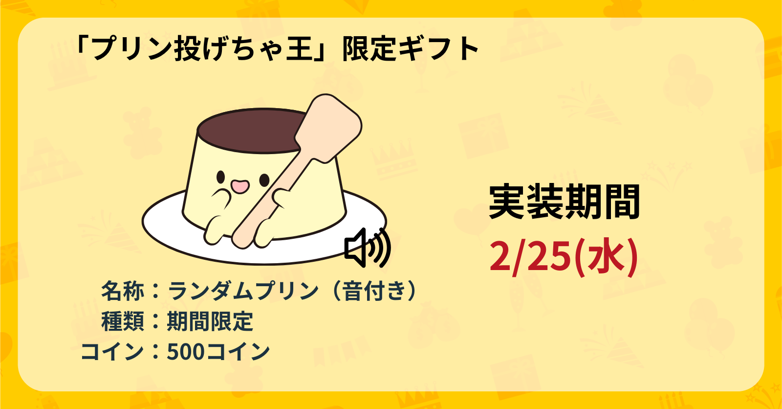 ①のランダムプリンと同じ出目・確率のものに音声がついランダムプリン(音付き)も500コインで実装されます。