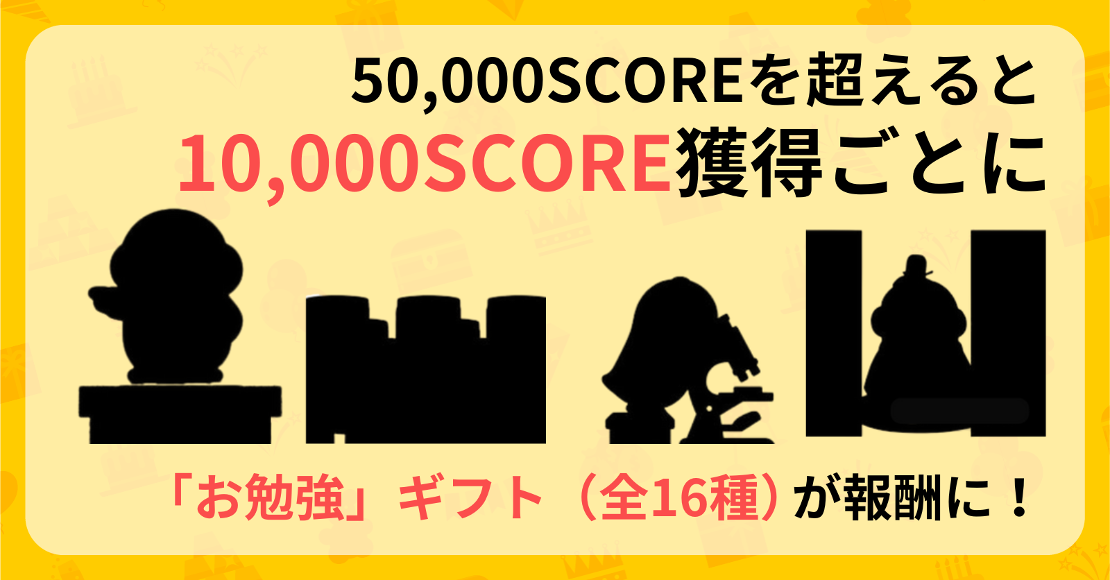 本イベント期間中にイベント限定ギフトから獲得した総獲得 SCOREが50,000 SCOREを超えた方には、10,000gごとに好きな「お勉強」ギフトを一つプレゼント!