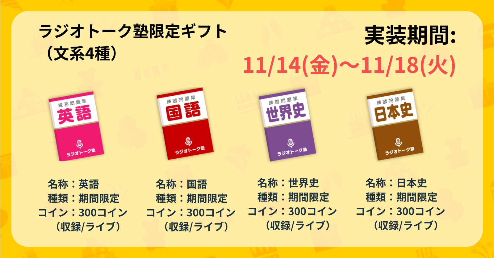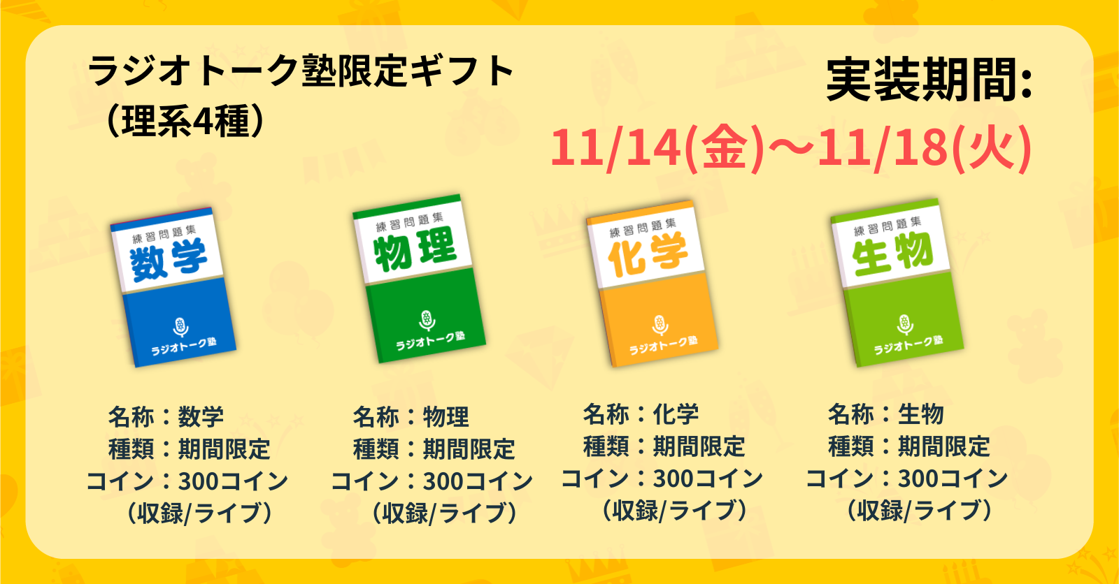 ※「お勉強」ギフトは最大40種ありますが、選択できるのは一人最大16種までとなります。また、選択数が5個以上の場合は一つのランダムギフト(すべて等確率)として実装されますのでご注意ください。
