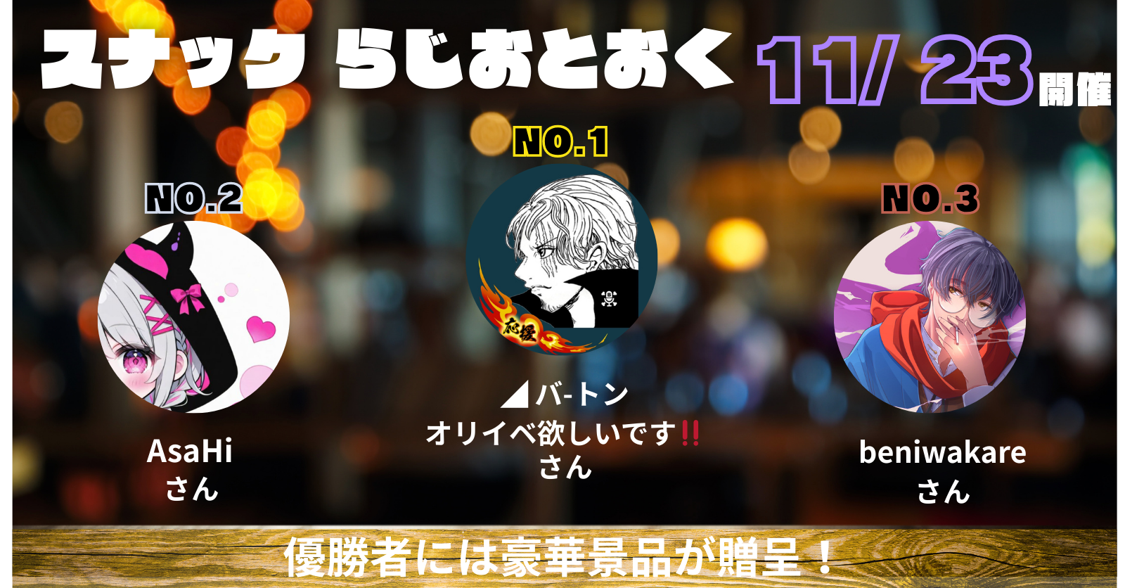 「スナック らじおとおく」で1位となった配信者には各称号を付与いたします。