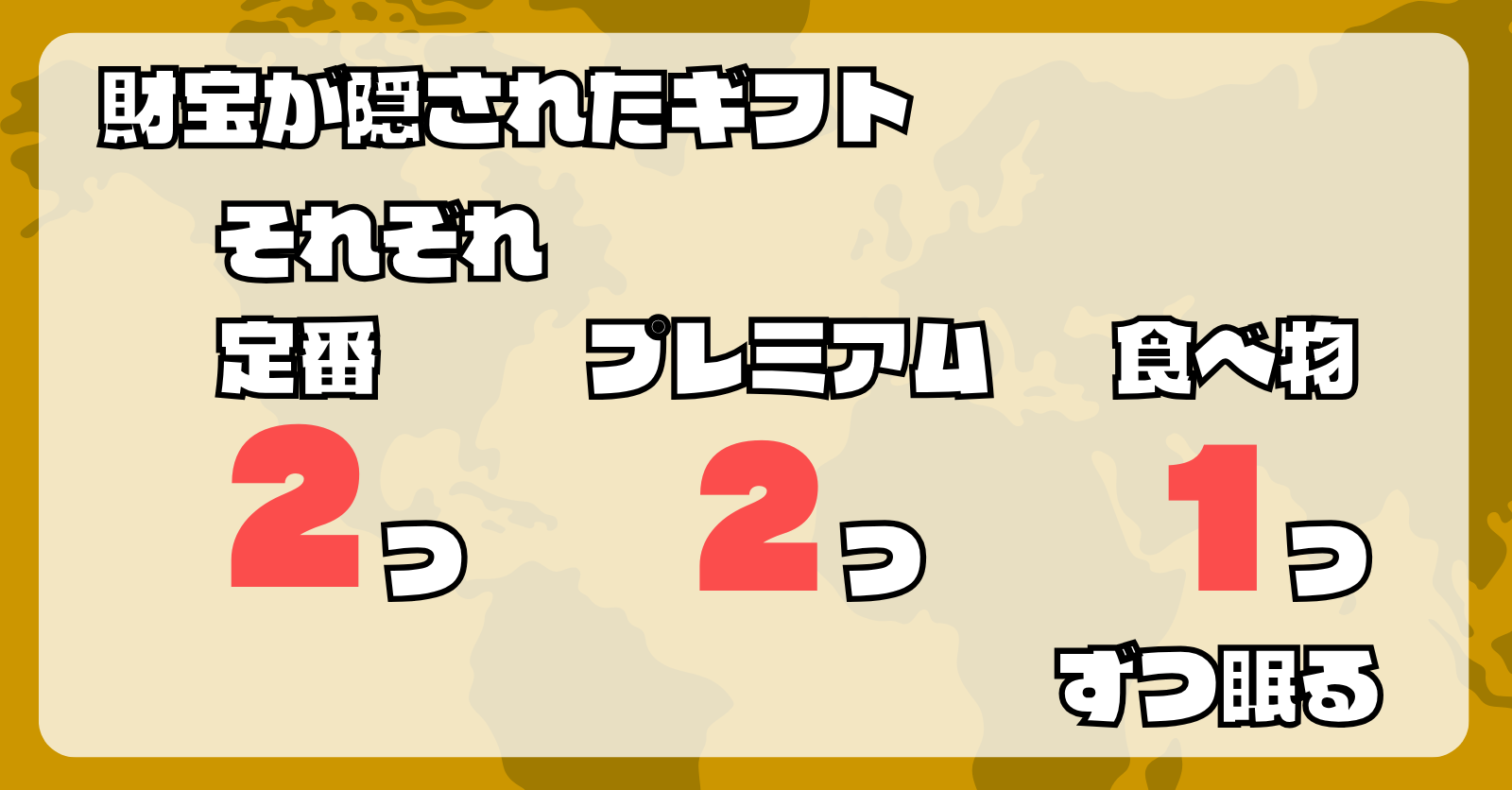 また財宝が隠されたギフトは、定番ギフトの中に2つ、プレミアムギフトの中に2つ、食べ物ギフトの中に1つ隠されています(特定のユーザーによって作成されたギフトは対象外となります)。