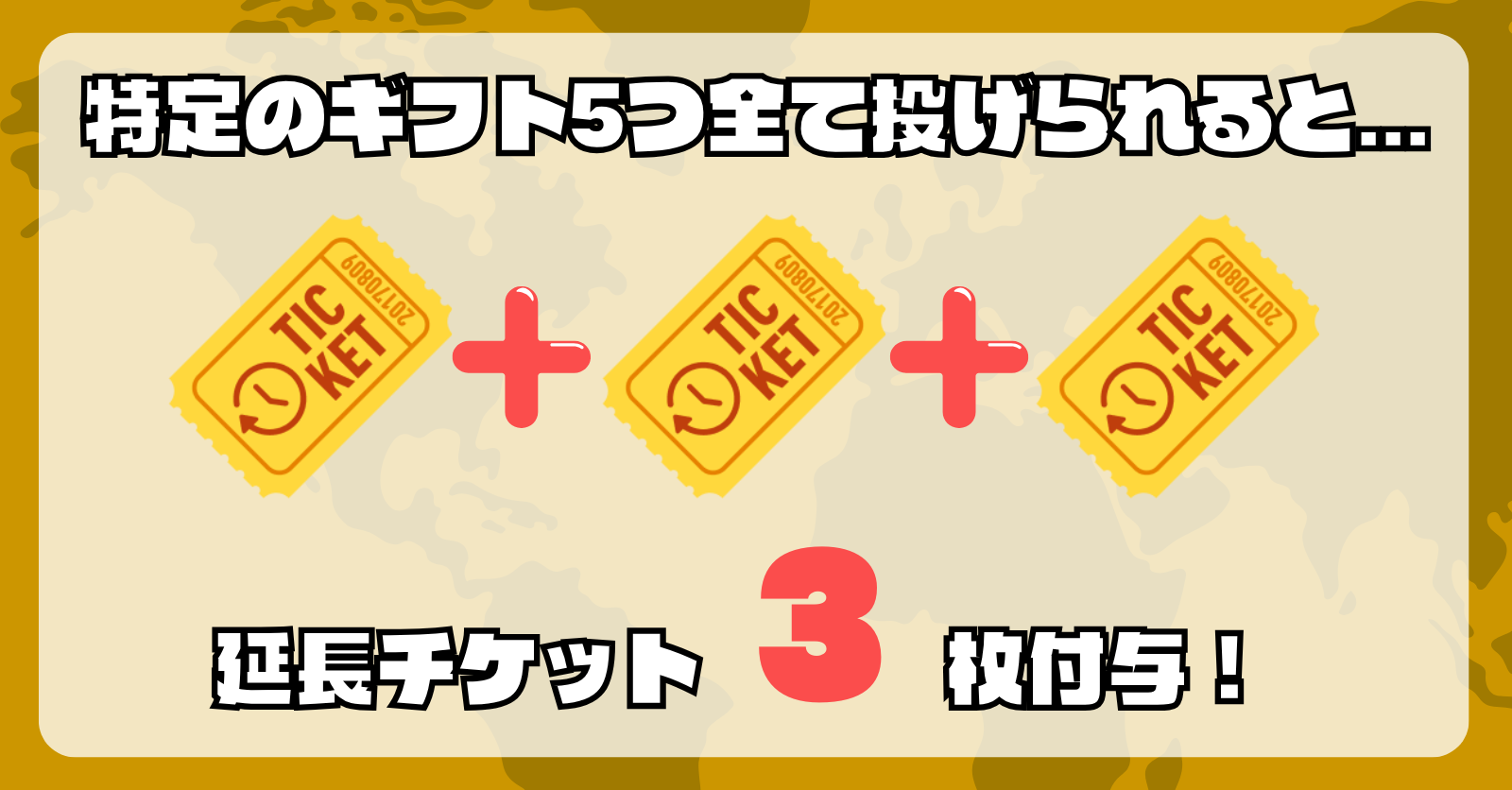 期間内の配信中に「財宝が隠されたギフト」5つすべてをリスナーから貰った配信者には、延長チケット3枚が付与されます。